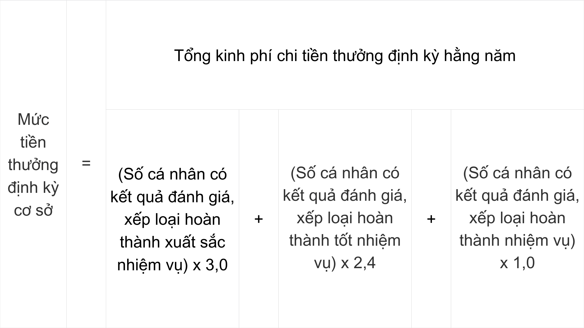 - Mức 2 (cá nhân hoàn thành tốt nhiệm vụ): Thưởng số tiền bằng 2,4 lần mức tiền thưởng định kỳ cơ sở;