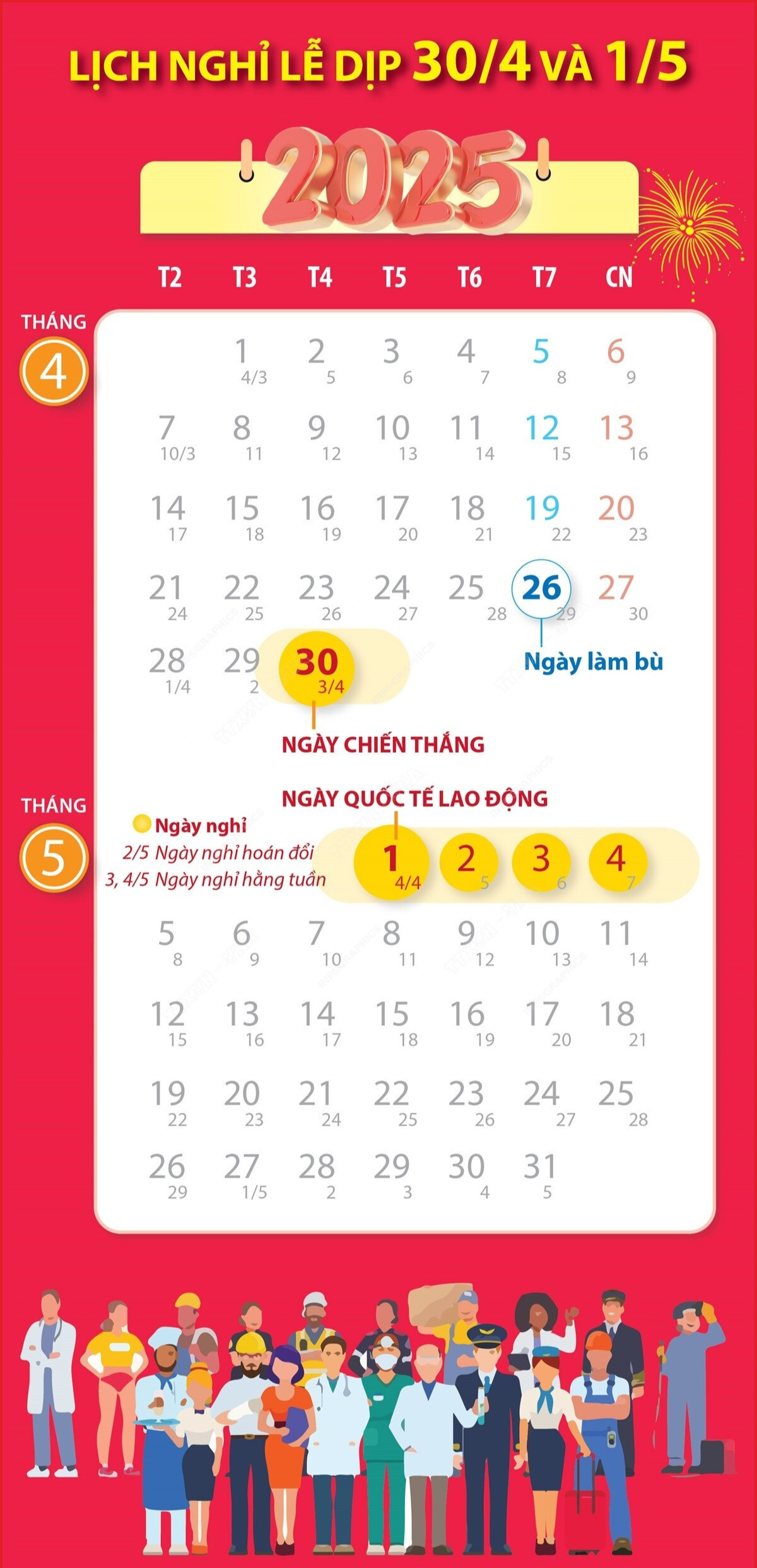 Như vậy, dịp nghỉ lễ ngày Chiến thắng 30/4 và Ngày Quốc tế Lao động 1/5/2025, công chức, viên chức được nghỉ 5 ngày liên tục từ thứ Tư ngày 30/4/2025 đến hết Chủ nhật ngày 4/5/2025 (làm bù vào thứ Bảy ngày 26/4/2025)