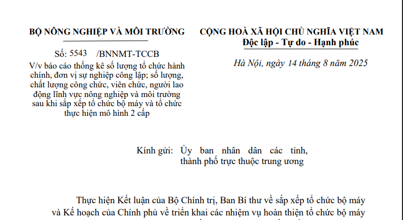 Bộ Nông nghiệp và Môi trường đề nghị Ủy ban nhân dân tỉnh, thành phố trực thuộc trung ương quan tâm, phối hợp thực hiện; gửi văn bản kèm theo file words, excel về Bộ Nông nghiệp và Môi trường (qua Vụ Tổ chức cán bộ) trước ngày 25/8/2025 và theo địa chỉ email: nnquynh@mac.gov.vn để tổng hợp, báo cáo cấp có thẩm quyền.