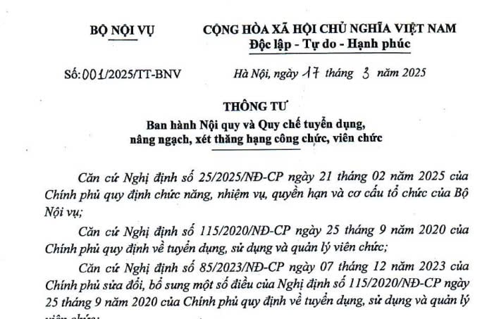 Ngày 17/3/2025, Bộ Nội vụ ban hành Thông tư 001/2025/TT-BNV ban hành Nội quy và Quy chế tuyển dụng, nâng ngạch, xét thăng hạng công chức, viên chức.