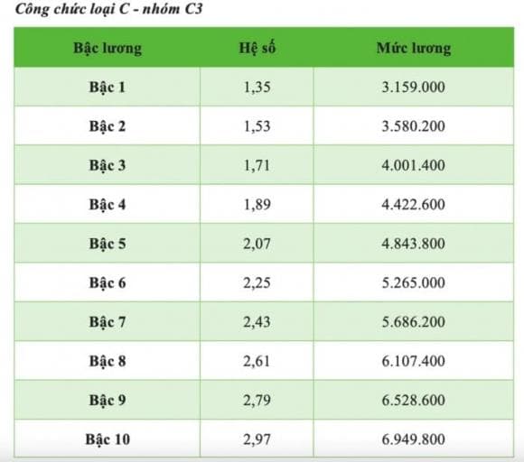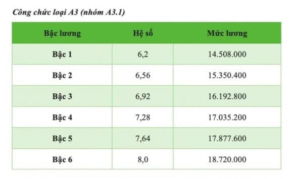 Theo quy định hiện hành, hệ số lương của công chức được phân loại theo cấp bậc. Công chức loại A, thuộc ngạch chuyên viên cao cấp hoặc tương đương, có hệ số lương cao nhất là 8. Công chức loại C, thuộc ngạch chuyên viên hoặc tương đương, có hệ số thấp nhất là 1,35.